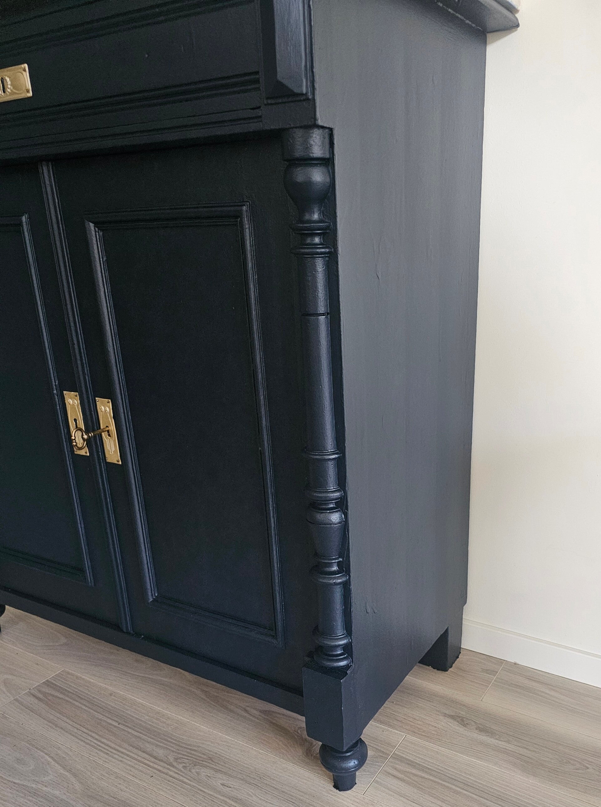 Deze karaktervolle antieke dienstmeidenkast is een waar pronkstuk. Het diepe Bluish Black geeft de kast een elegante, moderne uitstraling – zwart met een subtiele blauwe ondertoon die prachtig speelt met het licht. Het originele marmeren blad maakt het geheel compleet en straalt klasse uit.