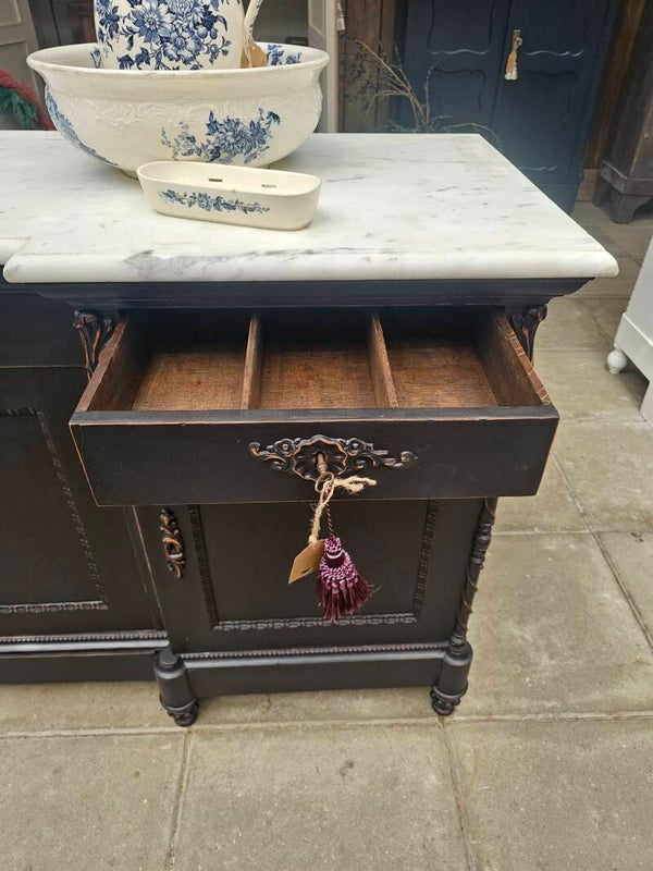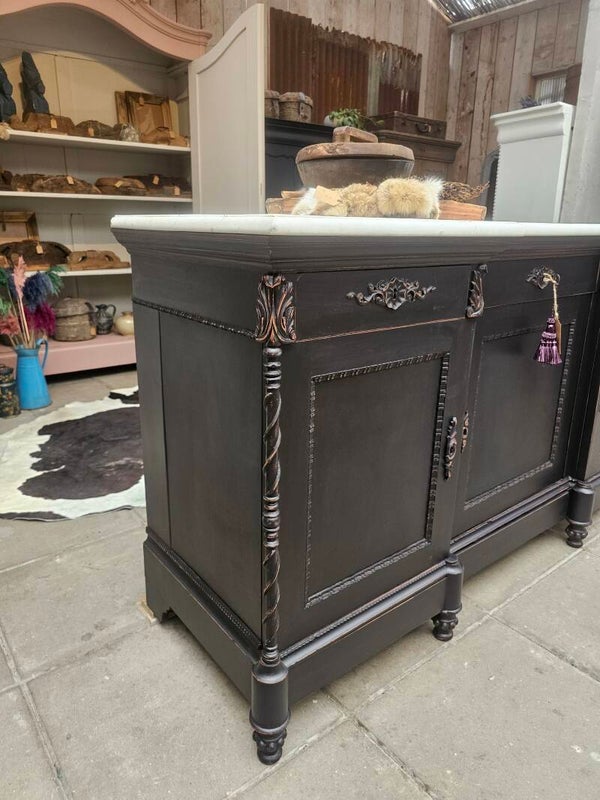 Dit schitterende antieke meubelstuk is een echte blikvanger en perfect te gebruiken als dressoir, toonbank of buffetkast. Met zijn diepe, matzwarte afwerking en subtiele koperaccenten straalt het karakter en stijl uit. Het massieve houtwerk en authentieke marmeren bovenblad maken het een duurzaam én charmant stuk voor elk interieur of winkelruimte.