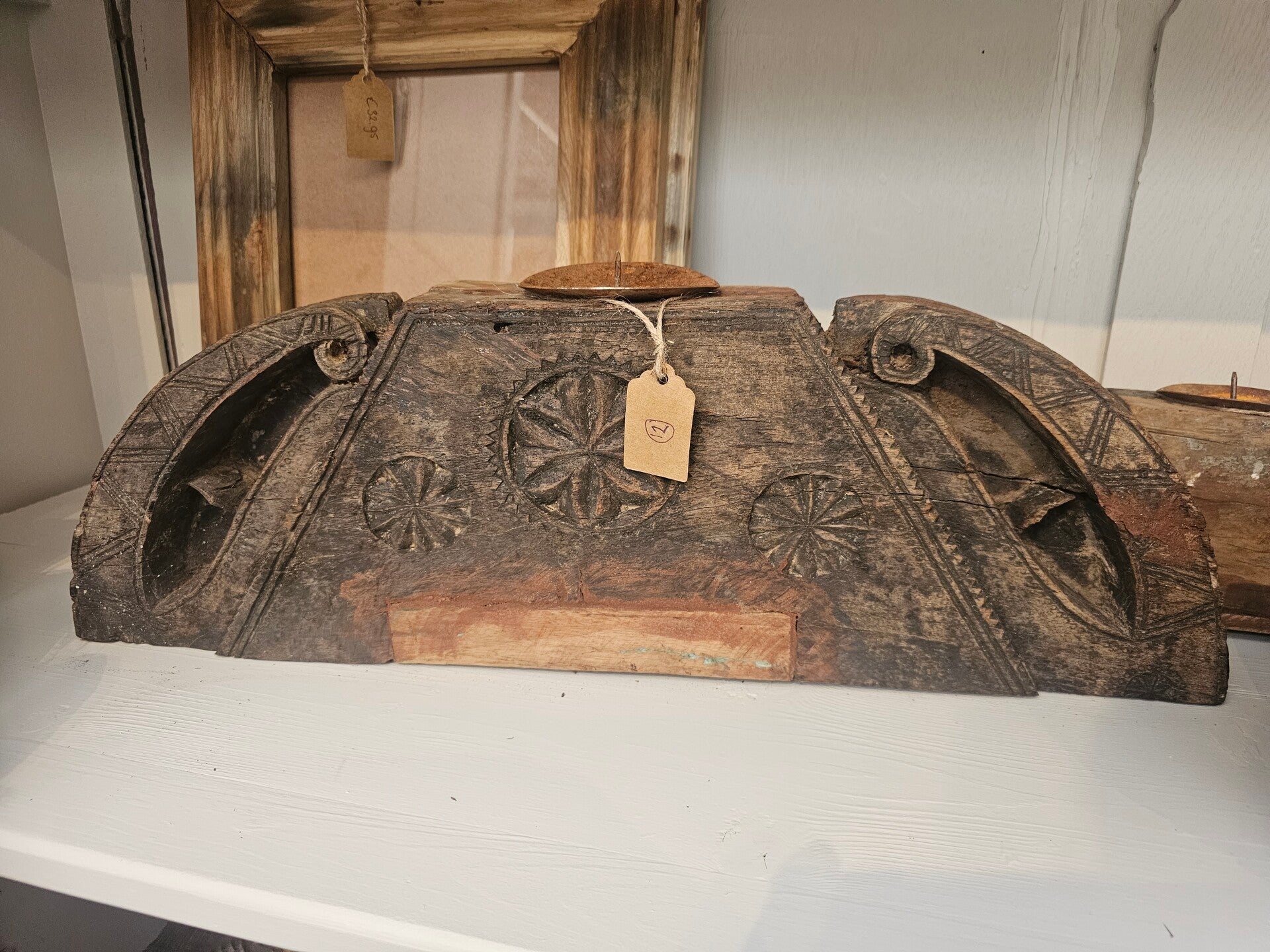 Breng een vleugje geschiedenis en karakter in je interieur met deze prachtige, authentieke kandelaar uit India. Dit unieke stuk is met de hand gesneden uit massief hout en draagt duidelijke sporen van zijn rijke verleden, wat het een robuuste charme en een doorleefde uitstraling geeft.