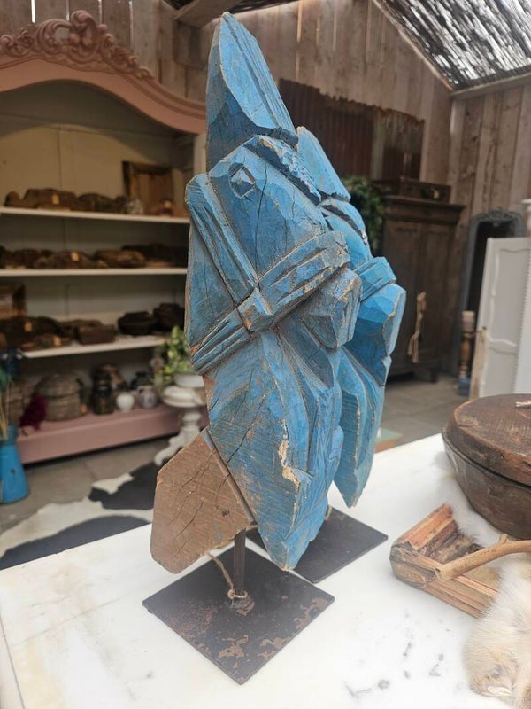 Deze unieke houten beelden uit India zijn echte eyecatchers! Met de hand gesneden uit massief hout en voorzien van een prachtig verweerd blauw patina, stralen ze karakter en geschiedenis uit. Elk beeld staat stevig op een metalen voet en brengt een vleugje wereldse charme in je interieur – perfect voor een boho, etnisch of vintage woonstijl.