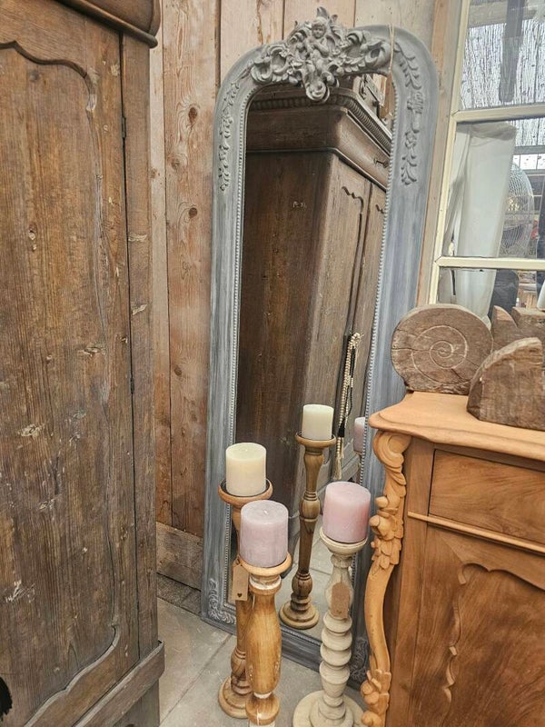 Deze grote, staande spiegel is voorzien van een rijkelijk gedecoreerde lijst met sierlijke ornamenten en een verweerde grijze afwerking – perfect voor een landelijke, brocante of klassieke inrichting.