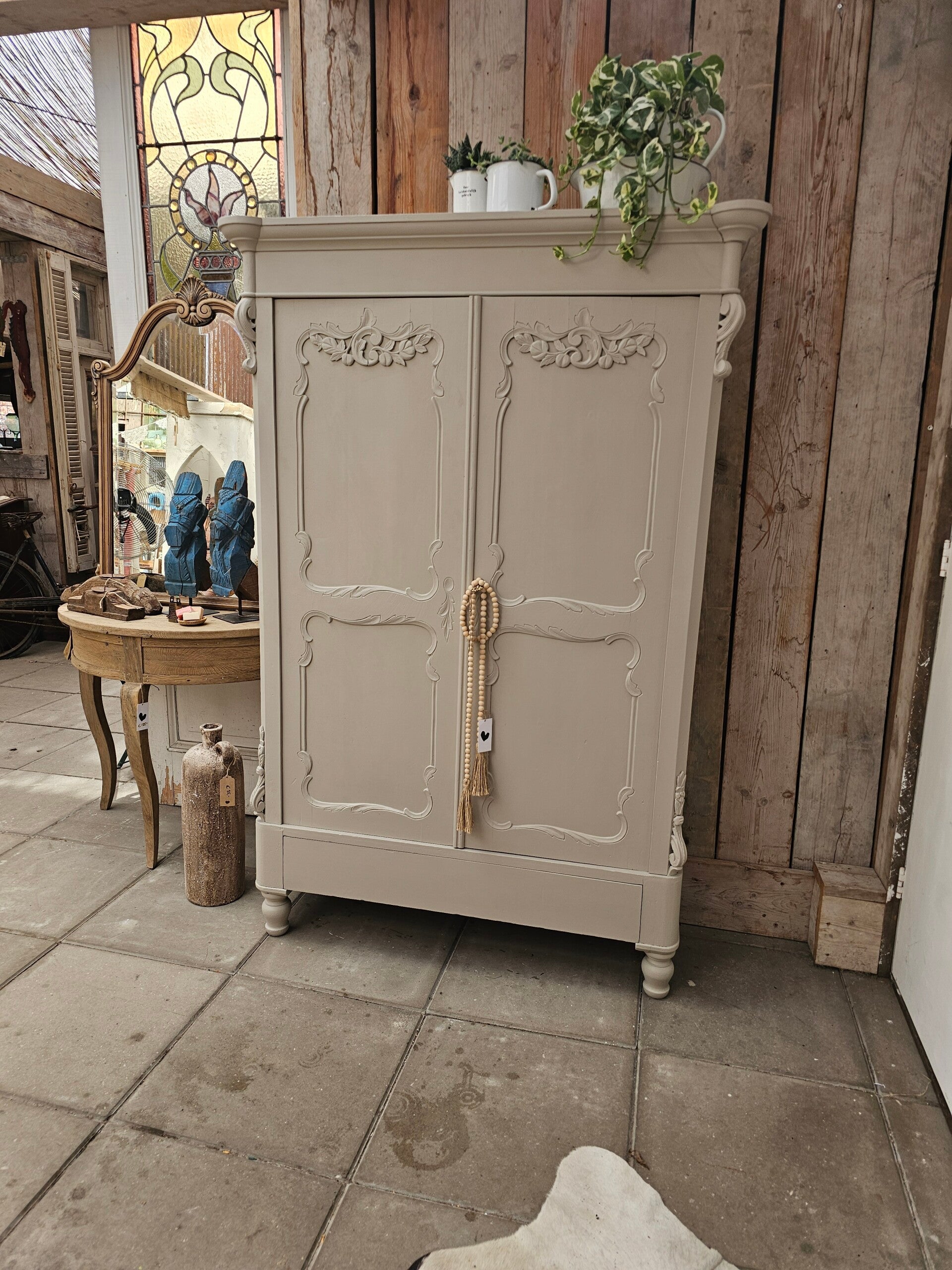 Deze elegante Biedermeier kast in de kleur sand/beige is een echte eyecatcher. Met het sierlijke houtsnijwerk en de tijdloze uitstraling past ze prachtig in zowel een klassiek als modern interieur.