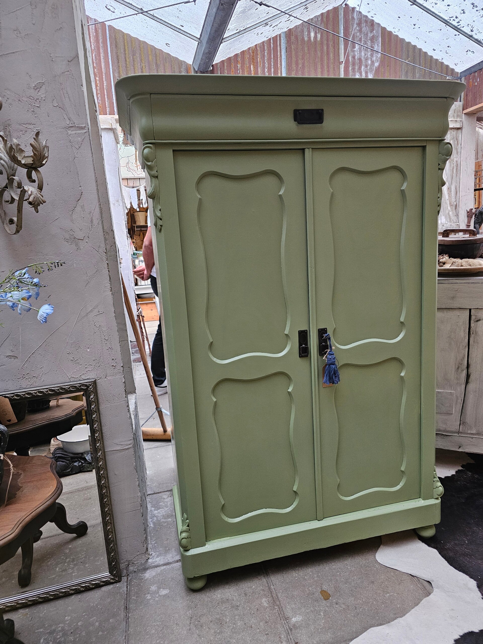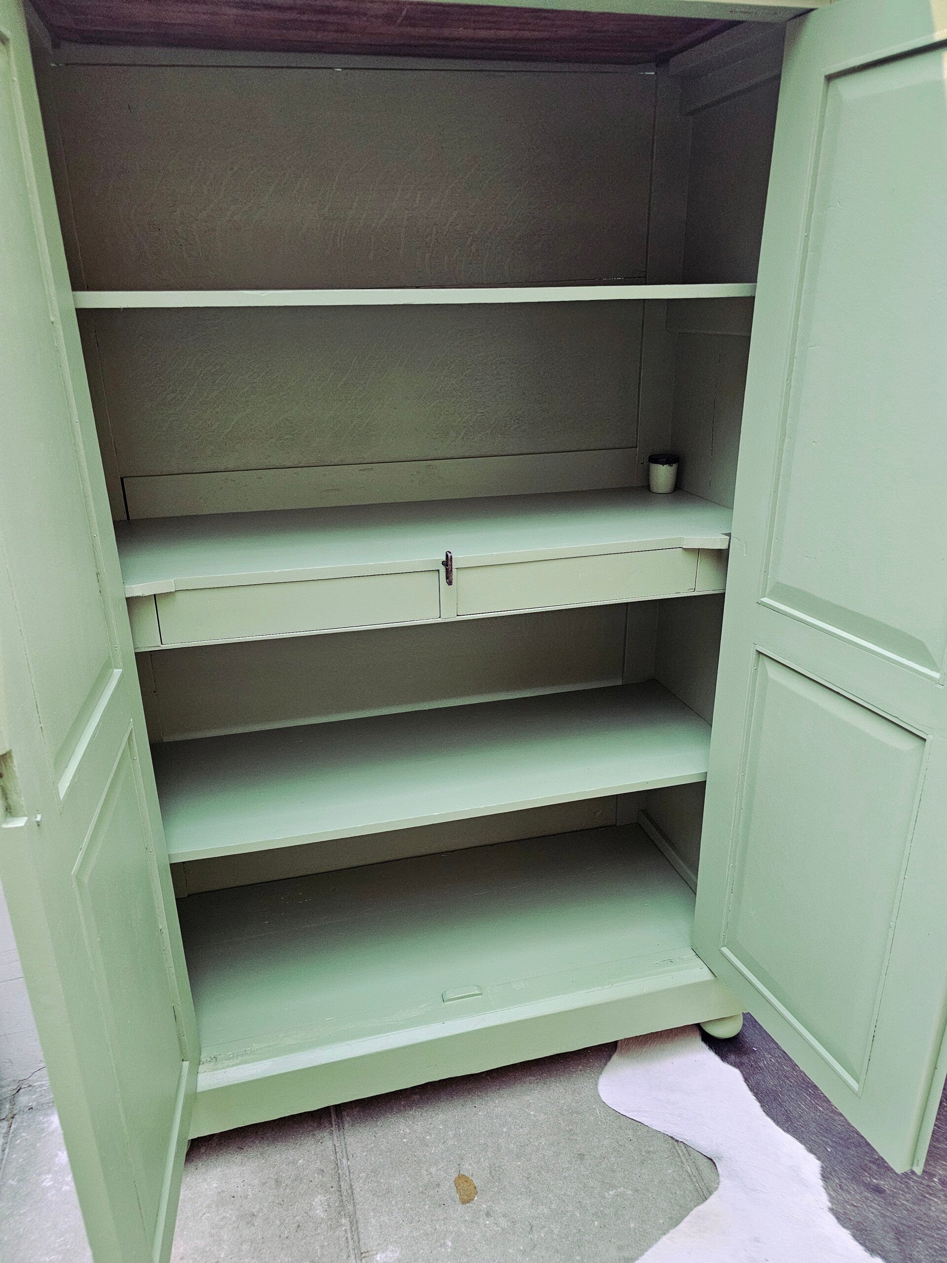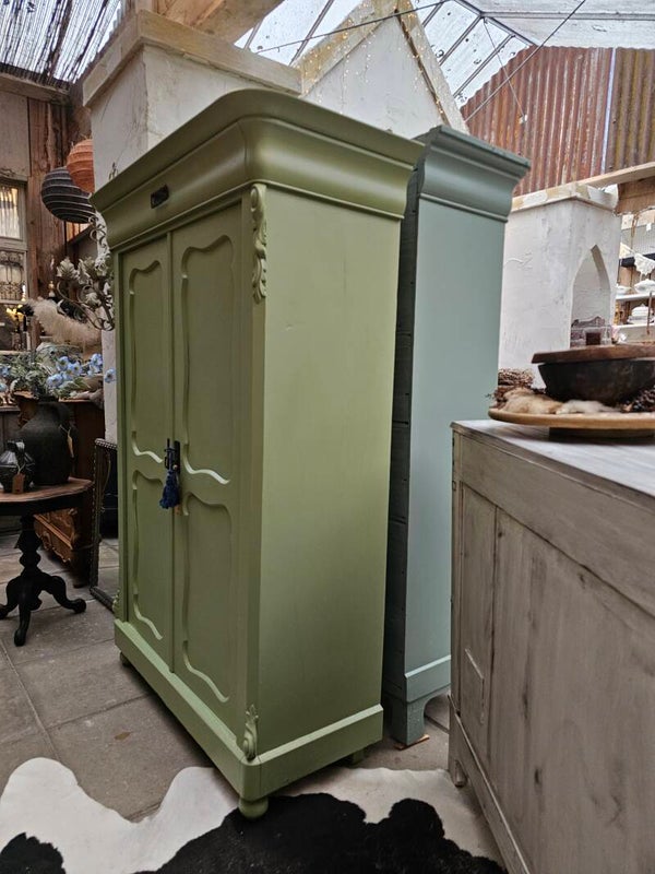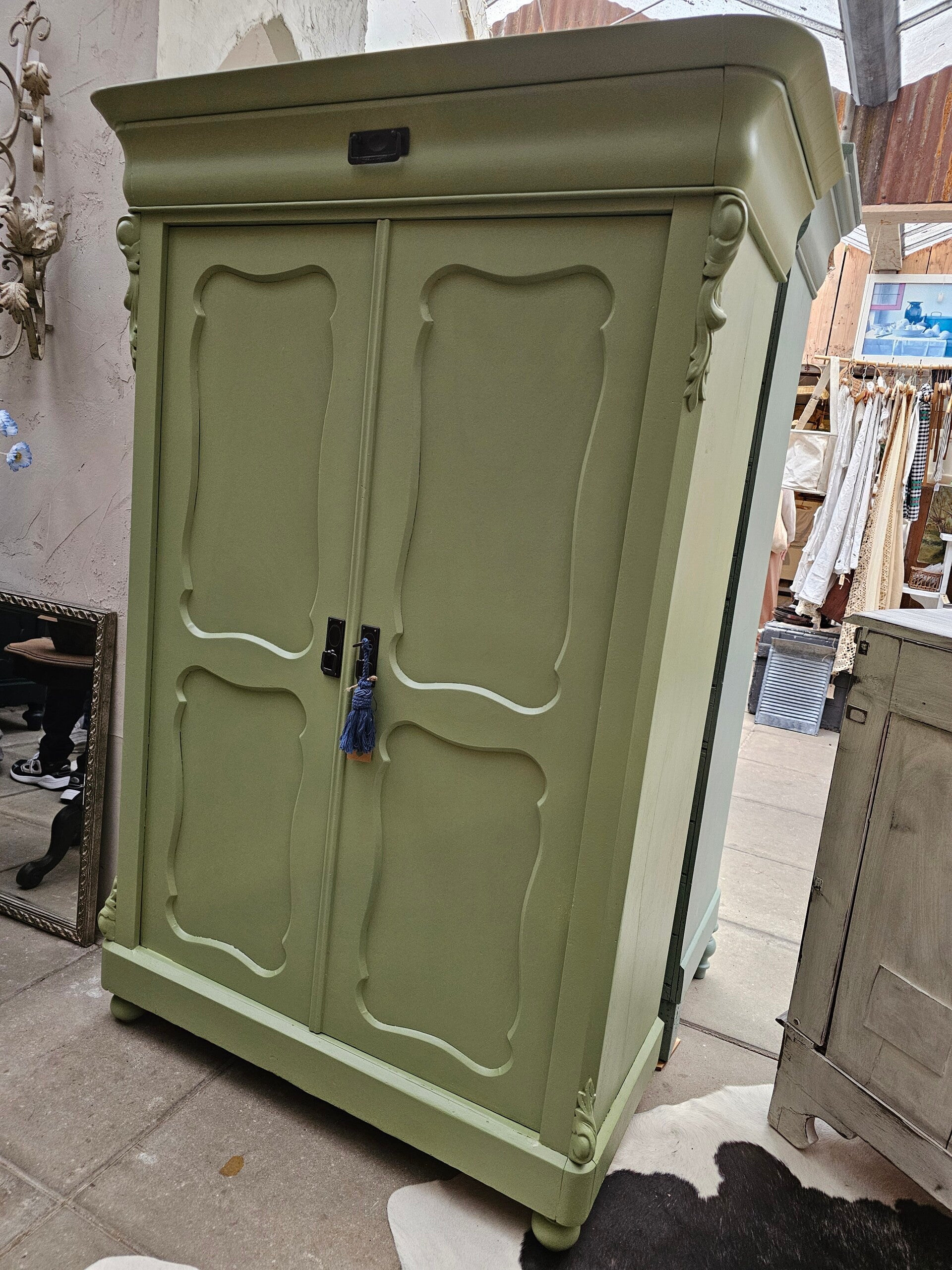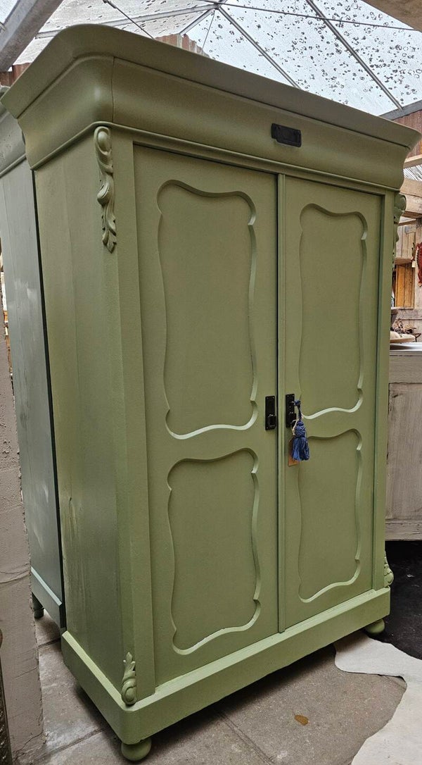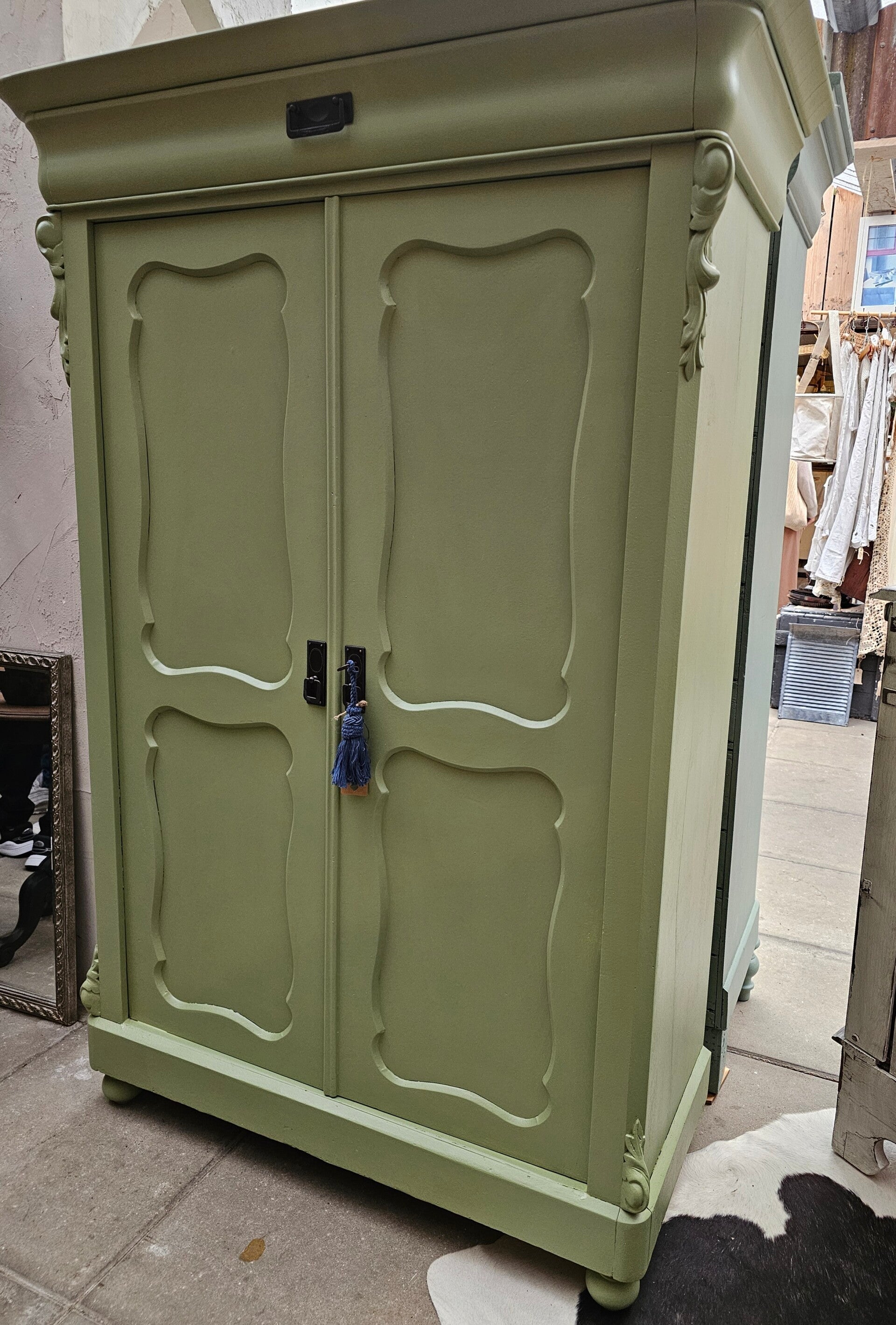 Een prachtige, authentieke Biedermeier meidenkast in de unieke kleur Olive Branch.