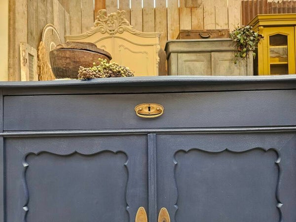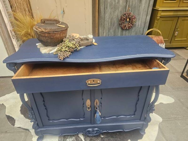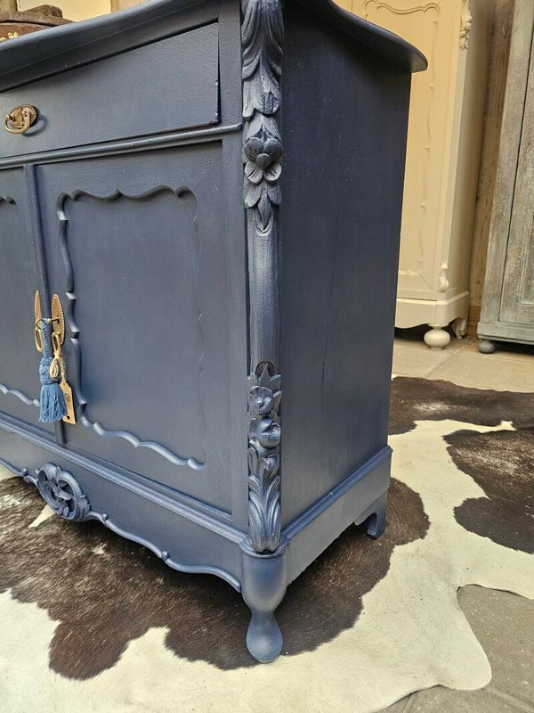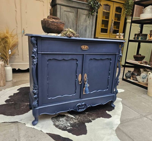 Deze prachtige vintage kast is helemaal opgeknapt en geschilderd in een stijlvolle donkerblauwe tint. De sierlijke details en ronde vormen geven ‘m een chique, speelse look – perfect als eyecatcher in je woonkamer, hal of slaapkamer!