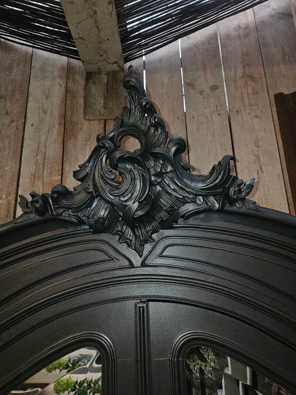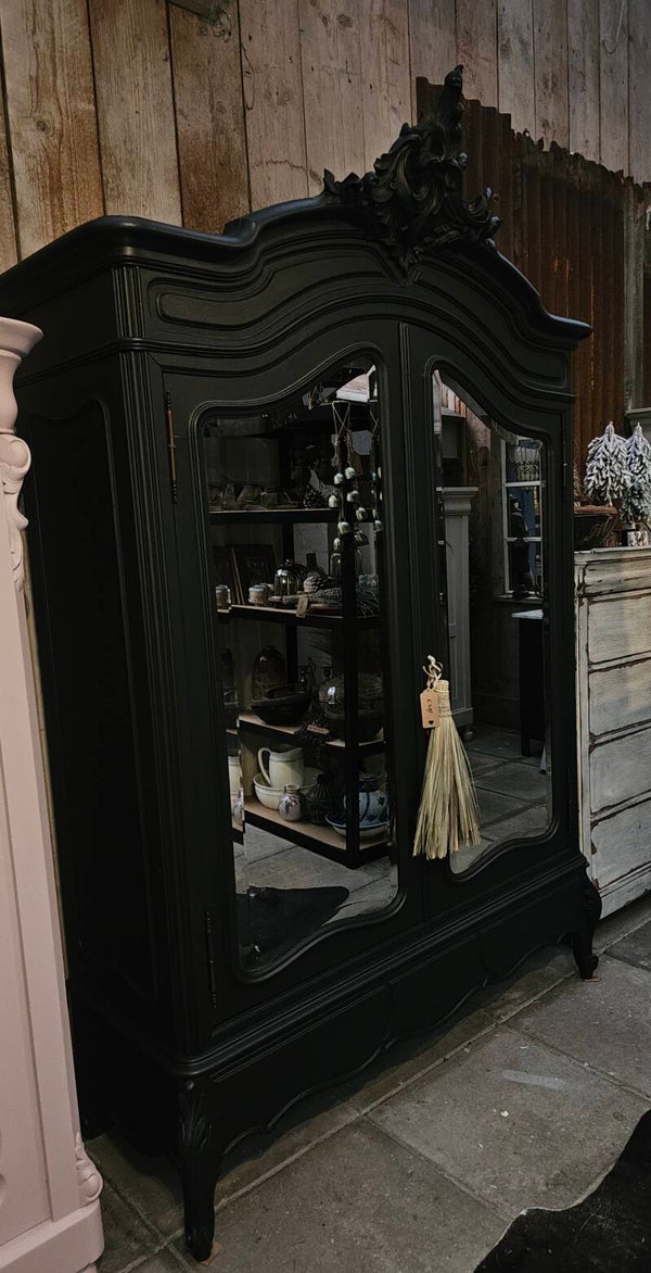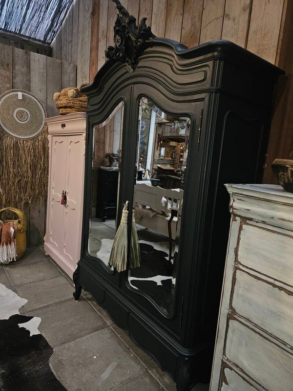 Op zoek naar een echte sfeermaker? Deze zwarte kuifkast is klaar om jouw interieur (of winkel!) dat beetje extra magie te geven. De sierlijke kuif, elegante vormen en twee grote spiegeldeuren zorgen voor een luxe uitstraling met een vleugje boutique-charme.