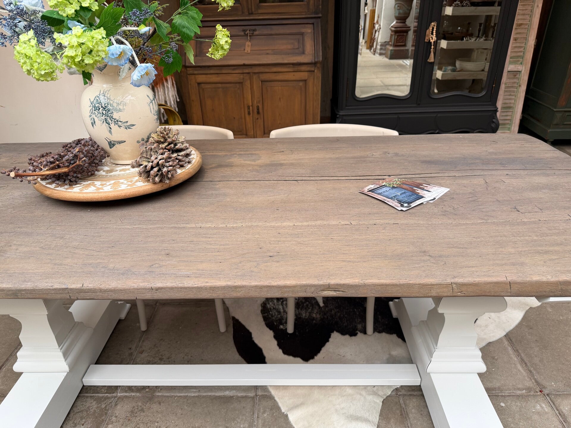 Prachtige massief eiken kloostertafel met een mooi geleefd blad, wat zorgt voor een warme en authentieke uitstraling. Het onderstel is eveneens van massief eiken en uitgevoerd in een stijlvolle witte kleur.